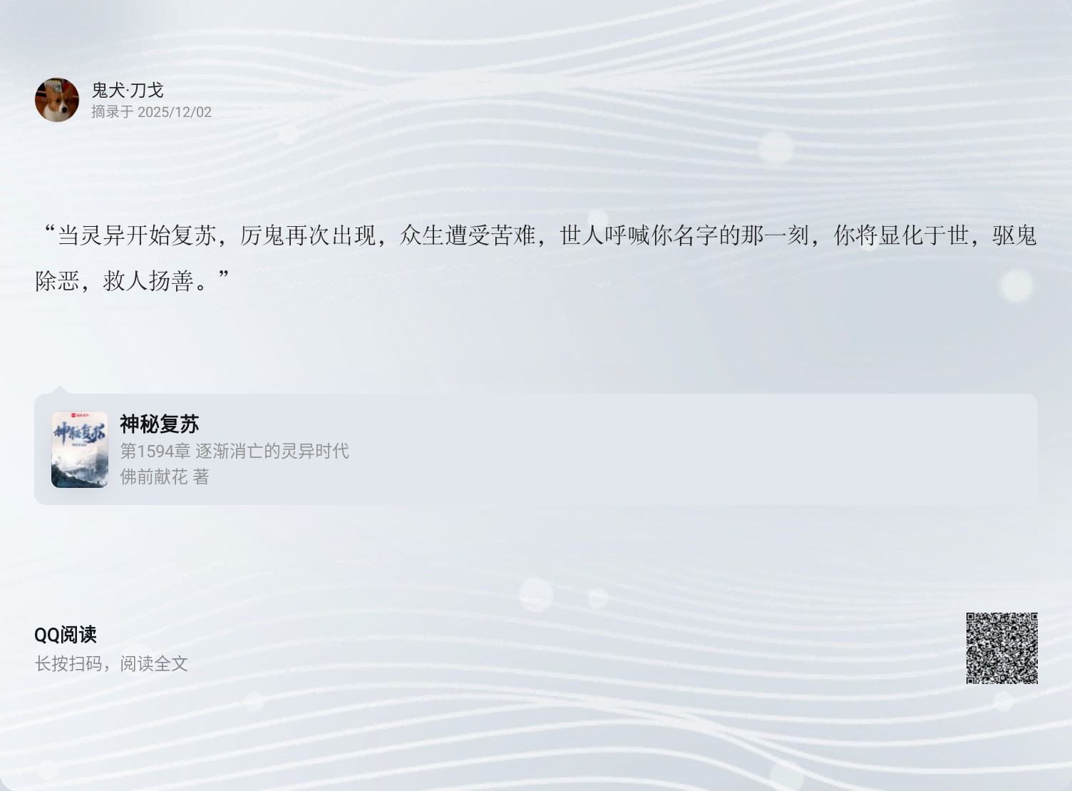 “当灵异开始复苏,厉鬼再次出现,众生遭受苦难,世人呼喊你名字的那一刻,你将显化于世,驱鬼除恶,救人扬善。”