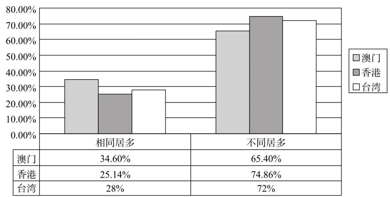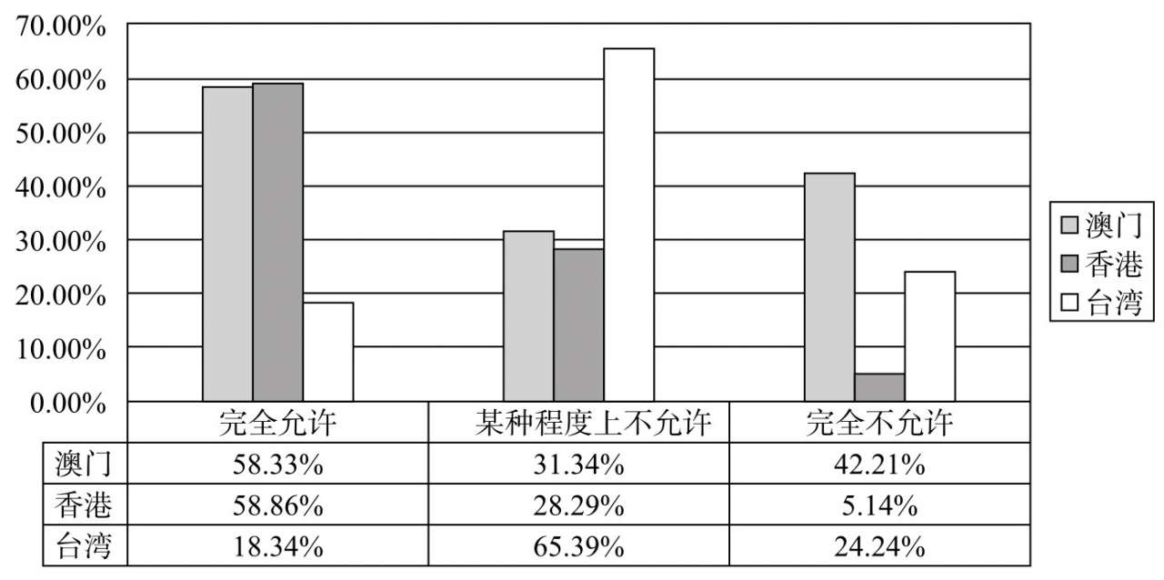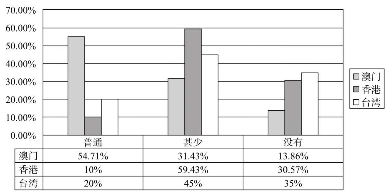 根据以上数据可以得出,香港和澳门地区完全允许所占的比例均超过半数,而台湾地区该选项所占比例只有18.34%;台湾地区在某种程度上不允许的选项中所占比例最高,达到65.39%;完全不允许学生使用简体字的情况澳门地区所占比例最高,达到42.21%,远远超过香港和台湾,可以推测澳门地区不同学校对于能否使用简体字差异很大。