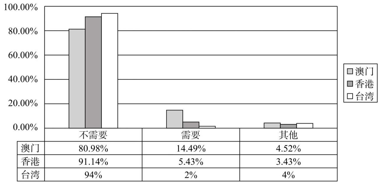 该题设置了三个选项,分别是不需要、需要、其他(包括没意见),港澳台三个地区的具体数据如下图表显示。根据图表很明显看出,港澳台地区九成的受访者认为不需要改为简体字教学。