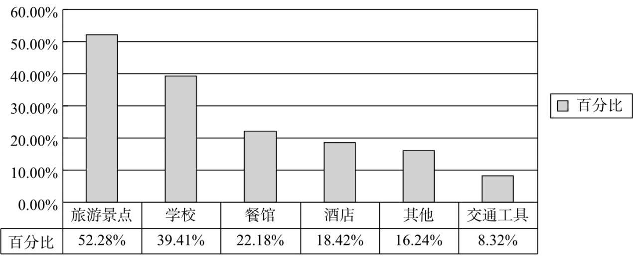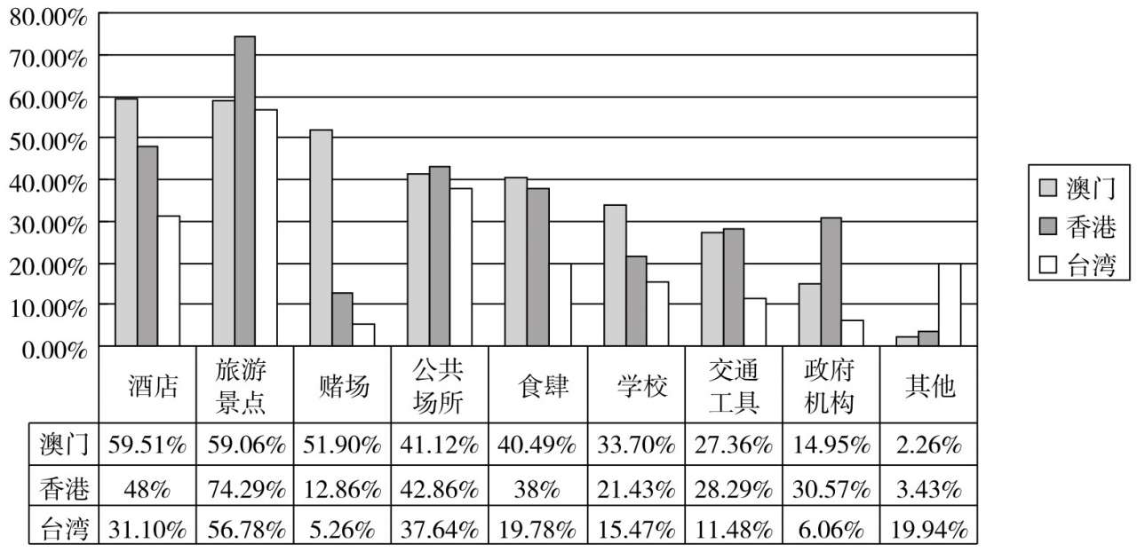 在港澳台地区的问卷中该题设置了九个选项,分别是酒店、旅游景点、赌场、公共场所、食肆、学校、交通工具、政府机构和其他(没有见过)。大陆(海南)地区问卷中该题设置了六个选项,分别是酒店、旅游景点、食堂、学校、交通工具和其他。因为大陆山东地区的问卷未设置相关问题,所以不列入对比。具体数据如下图表: