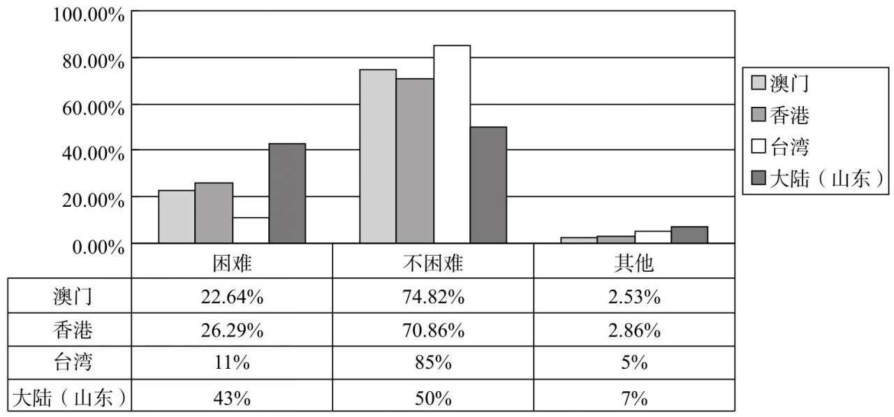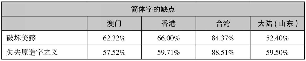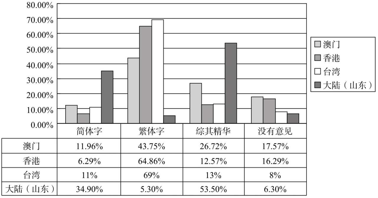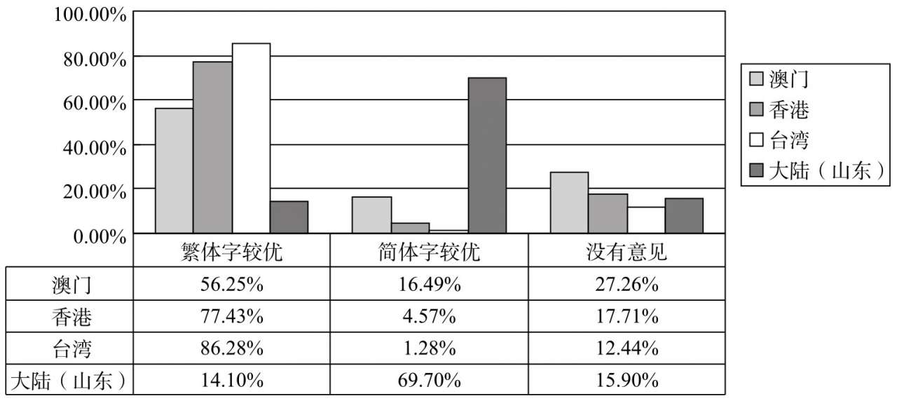 由图表数据可见,澳门、香港和台湾三个地区认为繁体字较优的人数最多,所占比例均过半数。在大陆山东地区则是认为简体字较优的人数最多,所占比例为69.70%。