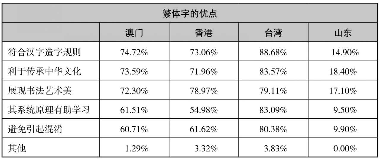 大陆山东地区调查发现普遍认为繁体字的优点较少,选择答案的人数不多,相对于港澳台地区选择回答该题的人数会略显较少。在大陆山东地区,选择繁体字有利于传承中华文化的人数最多,占调查人数18.4%;选择人数第二多的是能展现书法艺术之美,占调查人数17.1%;选择符合汉字造字规则和选择避免引起混淆的,占调查人数的14.9%和9.9%;最后是选择有助于学习的人数,占调查人数9.5%。