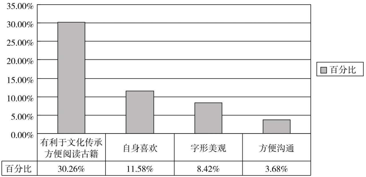 如图可见,选择书写麻烦笔画多的人数所占百分比最多,占调查人数30%,其他三个选项所占比例都很少,均不超过10%。结合上述数据分析得出,两岸四地普遍认为繁体字书写繁琐,笔画多,书写速度慢。