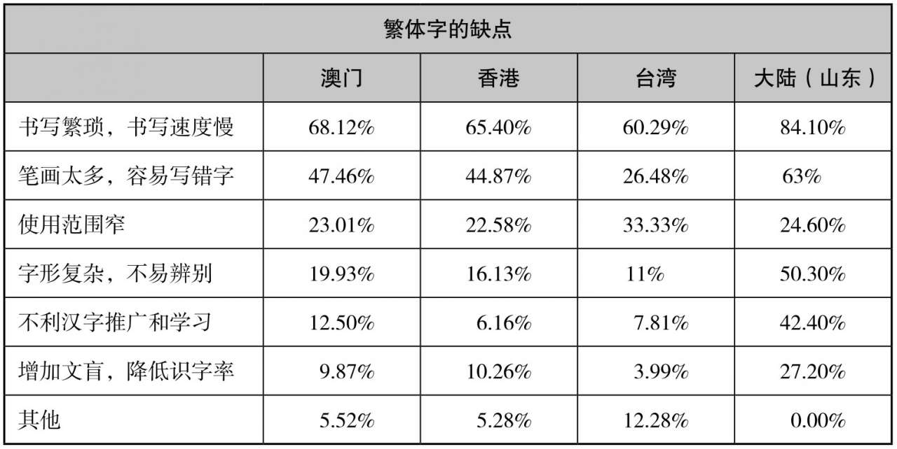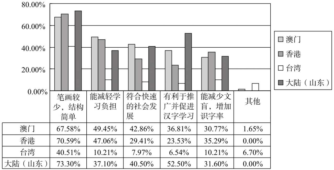 在台湾地区同样是选择笔画较少,结构简单,书写简便的人数最多,占调查人数40.51%;选择人数第二多的有两项,分别是能减轻学习负担和能减少文盲,增加识字率,占调查人数10.21%;然后依次是符合快速的社会发展,利于促进国际交流、其他和有利于推广并促进汉字学习。