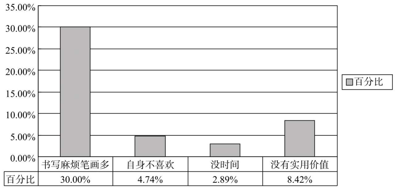 虽然大陆海南地区的调查问卷中未设置此题,但在问卷中设置了一道与此题相类似的开放性题目:“您希望或者不希望学习繁体字的理由是什么?”根据受访者的回答,将不希望学习繁体字的理由大致归为四个,分别是书写麻烦笔画多、没时间、没有实用价值和自身不喜欢。具体数据如下图表: