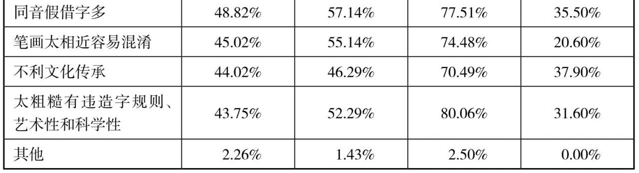 为了更深一步地了解人们对于简体字的态度,设置的该题给出了以下选项:破坏了传统汉字的美感;笔画太相近,容易混淆;不利于文化传承;太粗糙,有违汉字造字原则、艺术性和科学性;同音假借、一字多义,容易造成混淆;有些字失去了原来造字的意思和其他。具体数据如下图表: