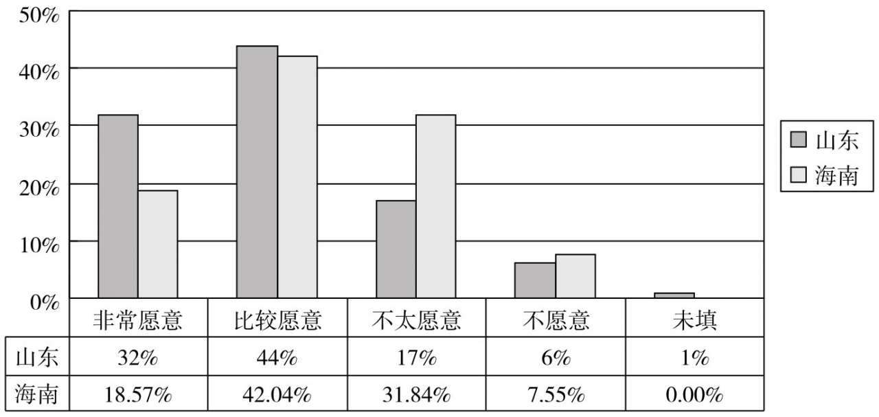 在大陆地区该题设置的选项有:非常愿意、比较愿意、不太愿意、不愿意和未填。具体数据图下图表: