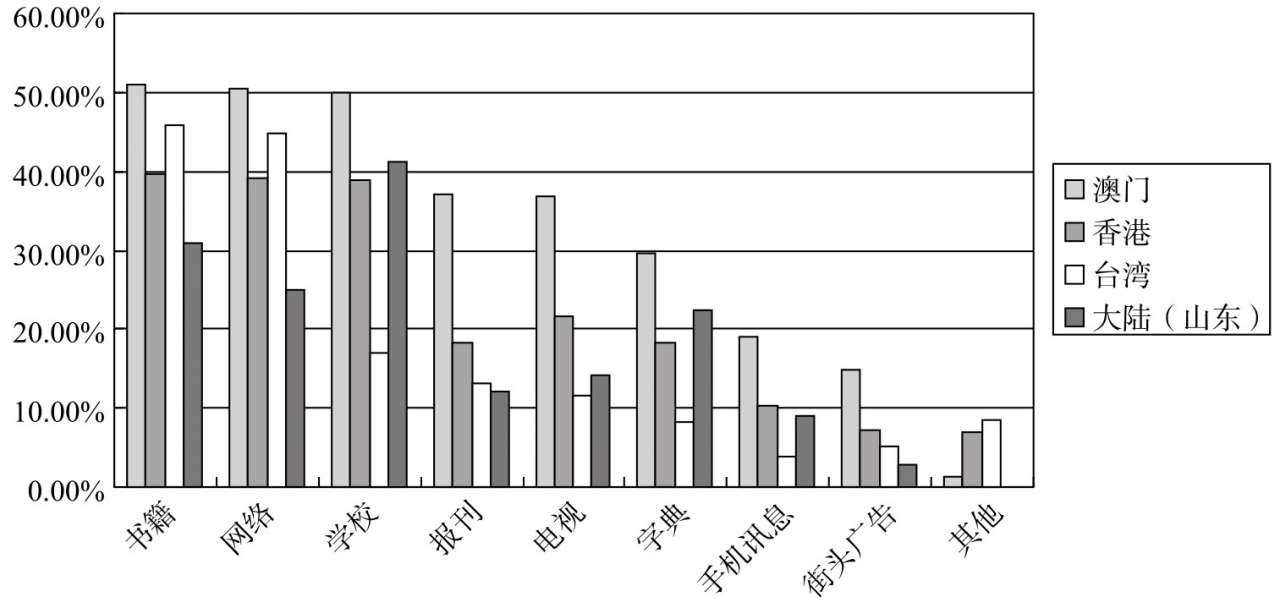 调查问卷中接触简体字的途径选项有书籍、网络、学校、电视、报刊、广告、手机短信、字典等。香港、澳门、台湾三个地区的受访者接触简体字的途径数据如下图: