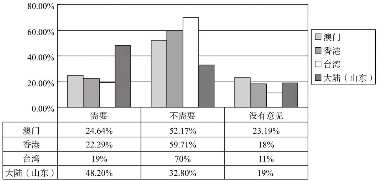 为了调查民众对统一文字的看法,设置了此题,选项有需要、不需要和没意见。由于大陆海南地区未设置该题,所以不列入对比。具体数据如下图表: