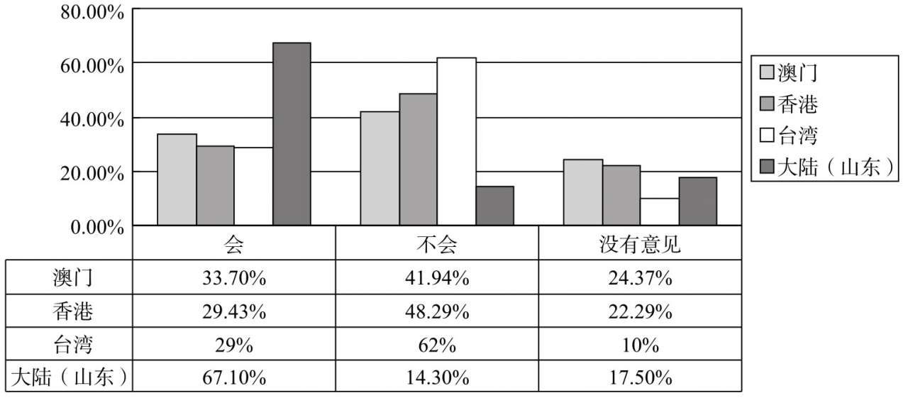 香港、澳门和台湾三个地区的数据显示,认为文字的统一不会促进文化融合的人数比例居多。而大陆地区的意见与之相左,选择文字统一会促进文化融合的人数比例最多,达六成以上。