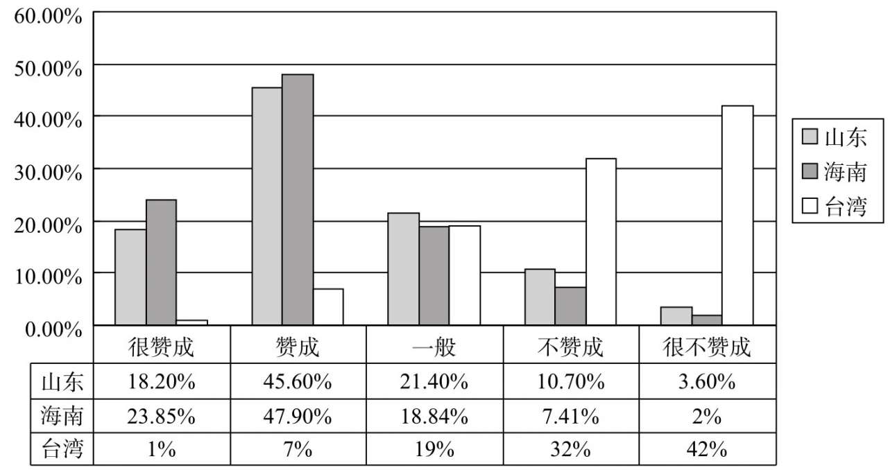 由图可见,大陆地区选择赞成和很赞成的人数比例要远远大于台湾地区选择这两项的人数比例;三个地区选择一般的人数比例相差甚微;而台湾地区选择不赞成和很不赞成的人数要远远高于大陆地区。两地关于该提议的态度截然相反。