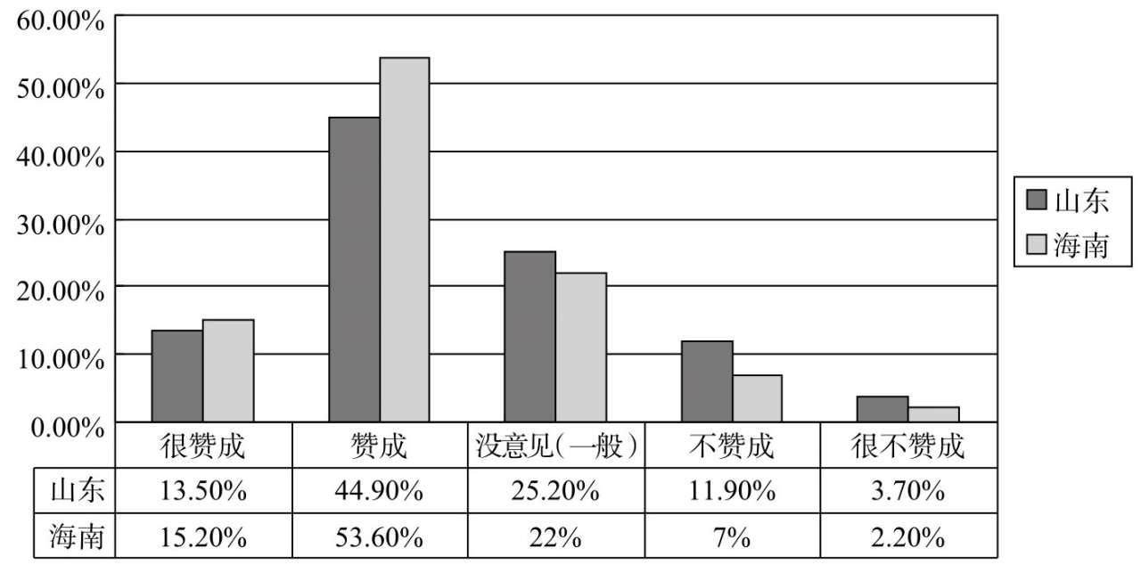 海南地区的问卷中有一道态度题是关于“对于学龄儿童,繁体汉字比简体汉字更难学”的看法,五个选项分别为很不赞成、不赞成、一般、赞成和很赞成。具体数据如下图表: