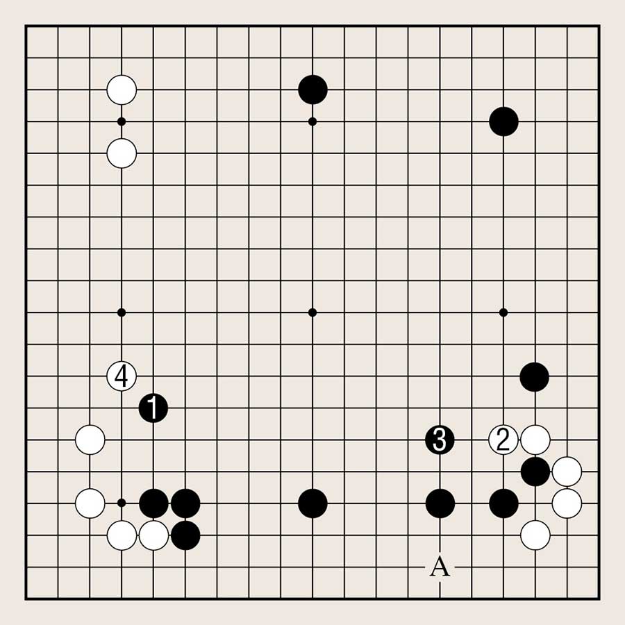 黑1是黑棋向中腹发展的重要一手。但由于角和边有很多大场,因此现在还不是时机。被白2占据要点,黑棋的外势就发挥不出其强大的威力。黑3尽管坚持努力向中腹发展,但由于A位的门敞开着,下边不能成大空。至白4,黑棋布局失败。结论为黑1是最差的点。