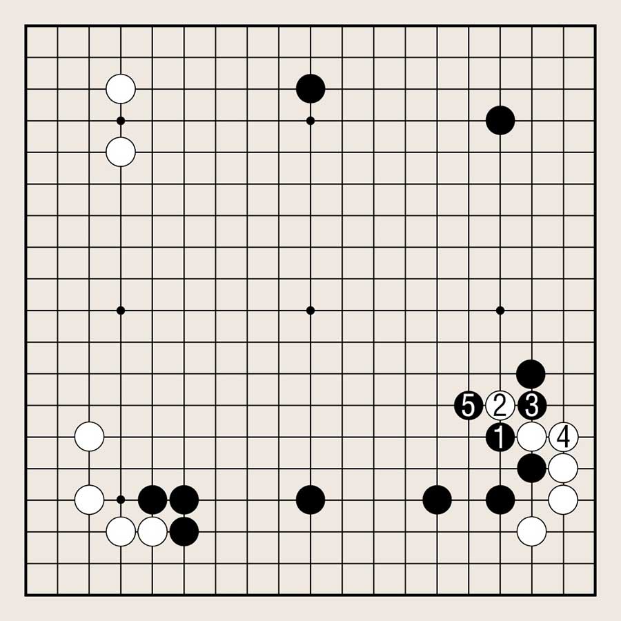 黑1虎,白2扳的手段也是有的。此时黑3打吃,白4粘,黑5征子成立,黑棋与图1相比,由于提了对方一子,可以筑起更强大的外势。