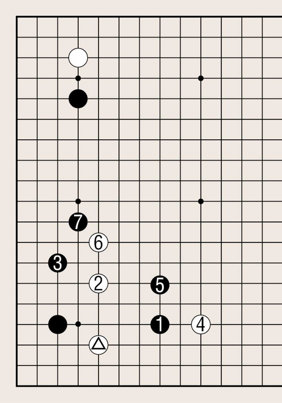 低挂,黑1夹攻时,白棋向中腹出头速度慢是缺点。白2大跳逃出,黑3拆,白棋仍在黑棋的追击圈内。白4反夹和白6跳虽都是白棋的基本行棋要领,但下至黑7,白棋形状仍不能让人放心。