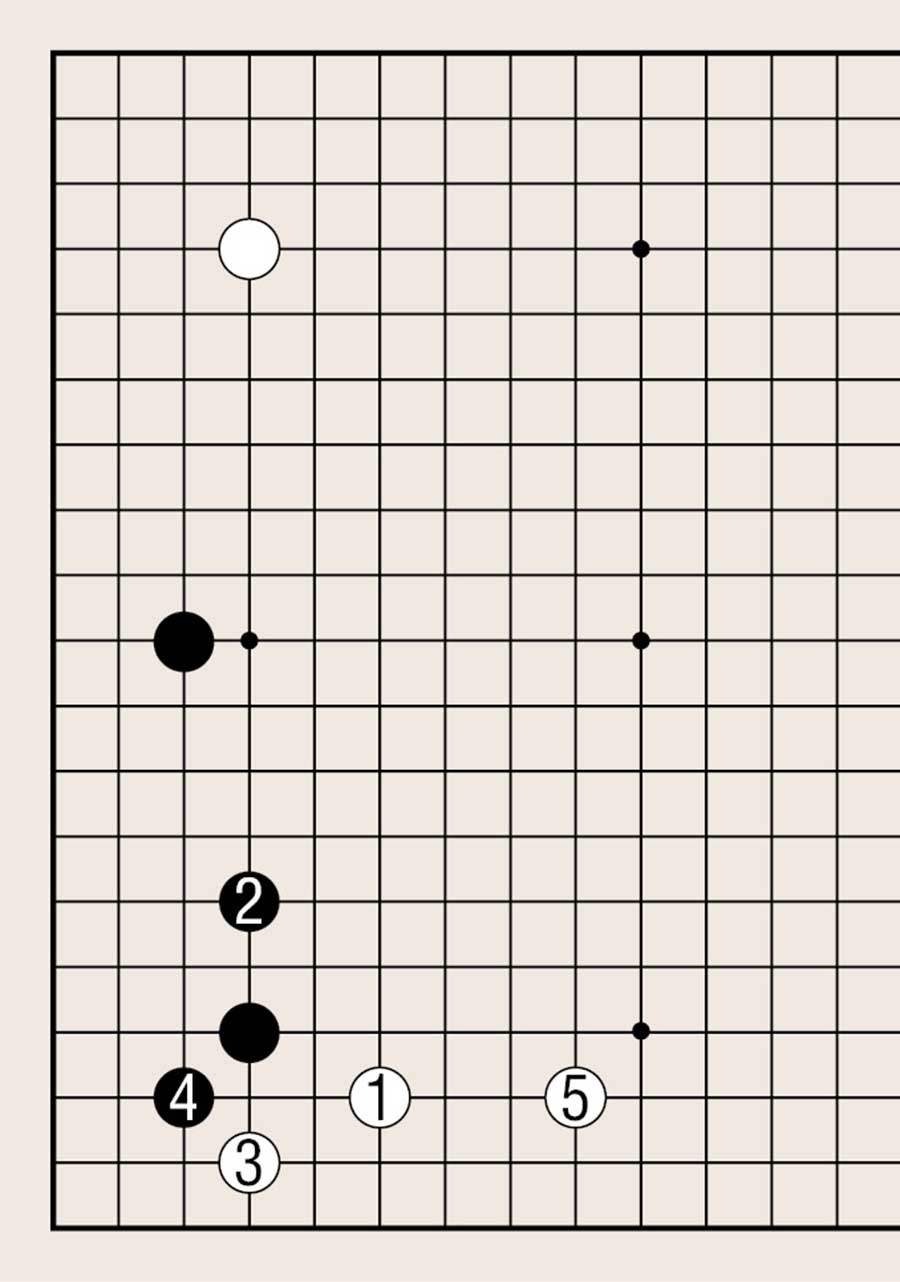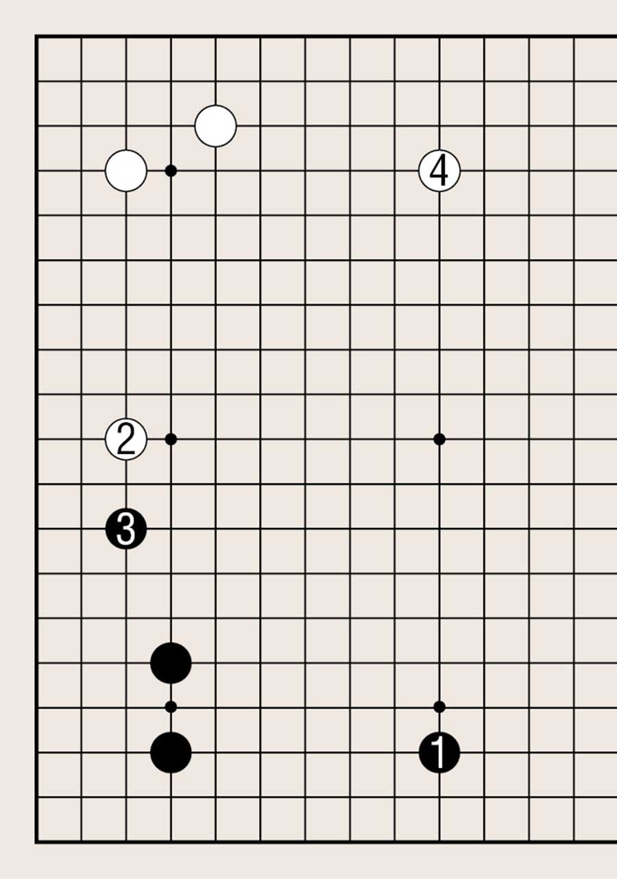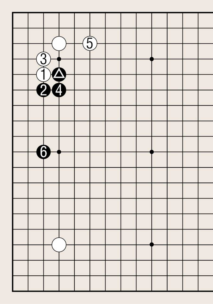 图4中的黑1虽然无疑是以角为根基向外扩张的要点,但不如白2大。白2是黑白双方以角为根基向外扩张的要点。白2拆后,黑3拦,白4再拆,白棋形成两翼张开的好形。全局来看,白棋的势力比黑棋更具有活力,白棋布局成功。