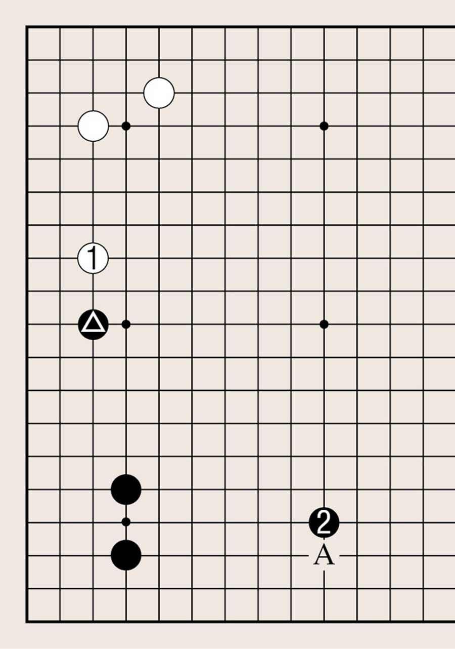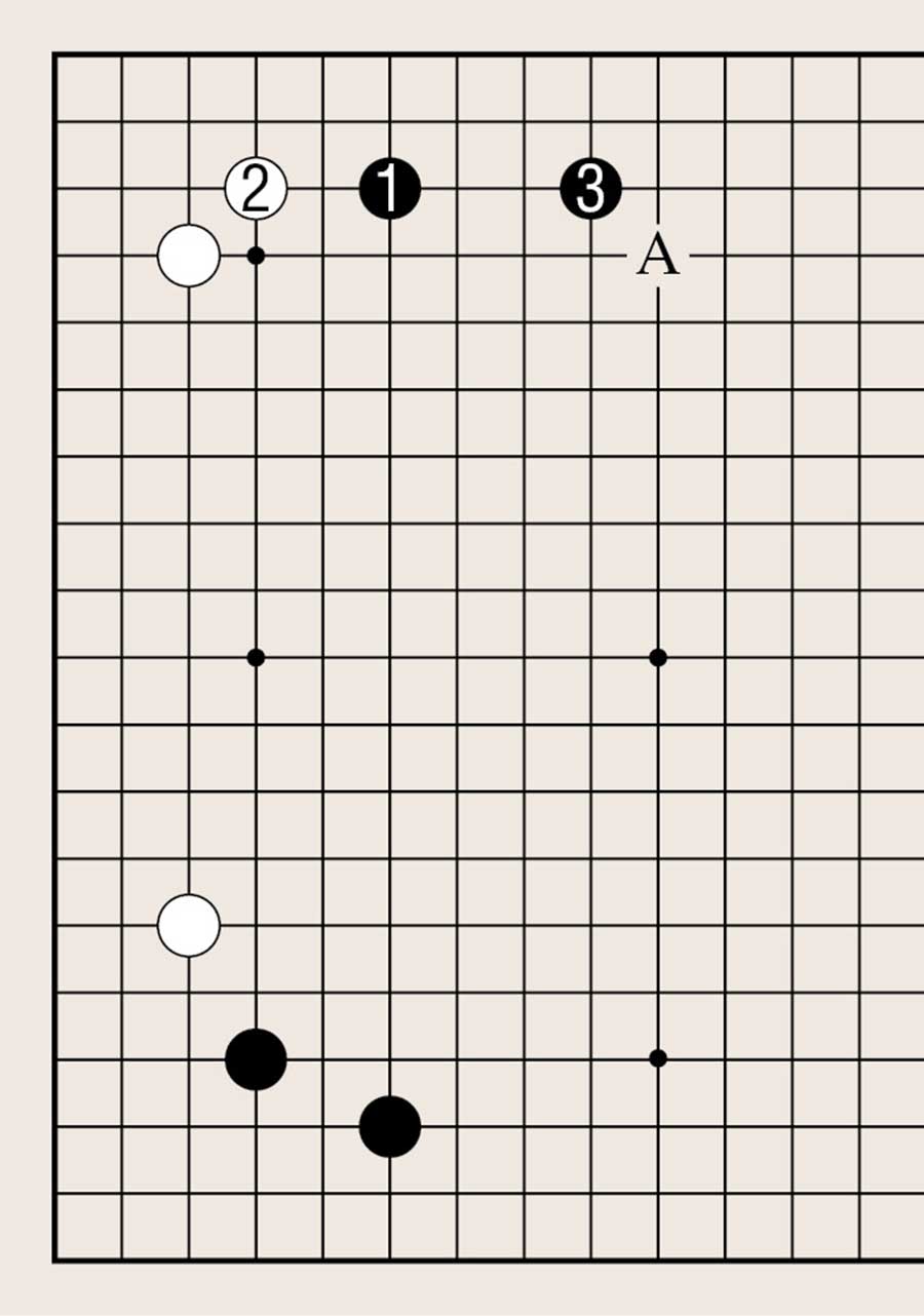 拆时,白1以角为根基在向外扩张的同时,也阻止黑棋外势的发展。但黑2(或A位)也是黑棋以角为根基向外扩张的要点,结果是黑棋好。如果在布局阶段,就让对方在角两侧扩张,大都不好。因此,白1一般会下在A位,以阻止黑棋在两侧拆。