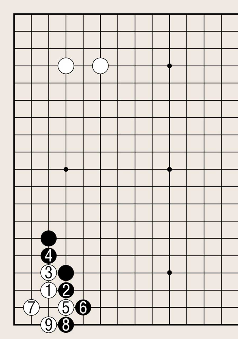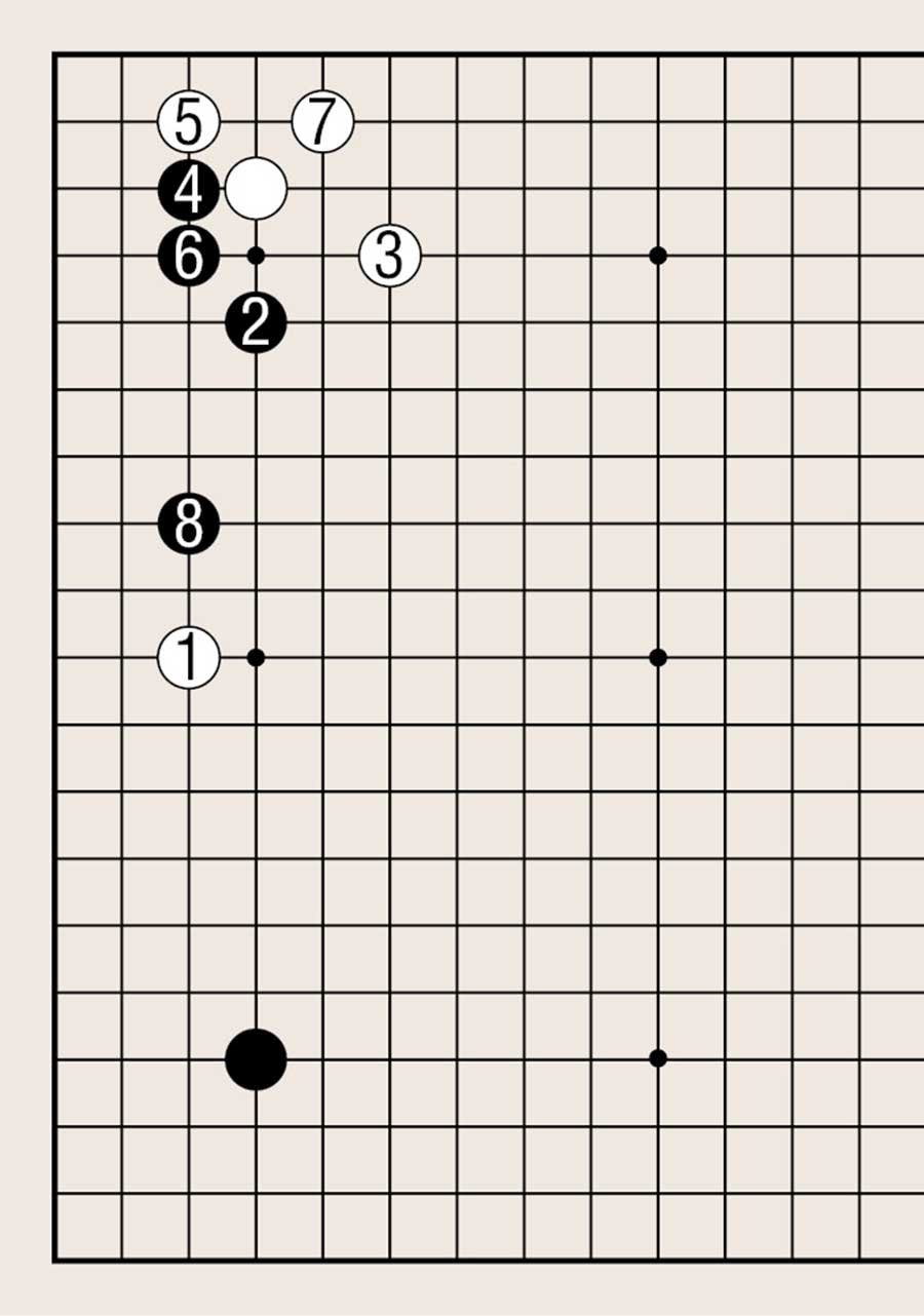图8中白1拆,封锁黑棋向边上发展的空间。黑方以缔角为根基,但如果向边的发展全部被封,大部分不会取得好结果。黑角被白1逼住,黑2跳,向中腹出头。黑棋从角上直接向中腹出头,黑棋不利。