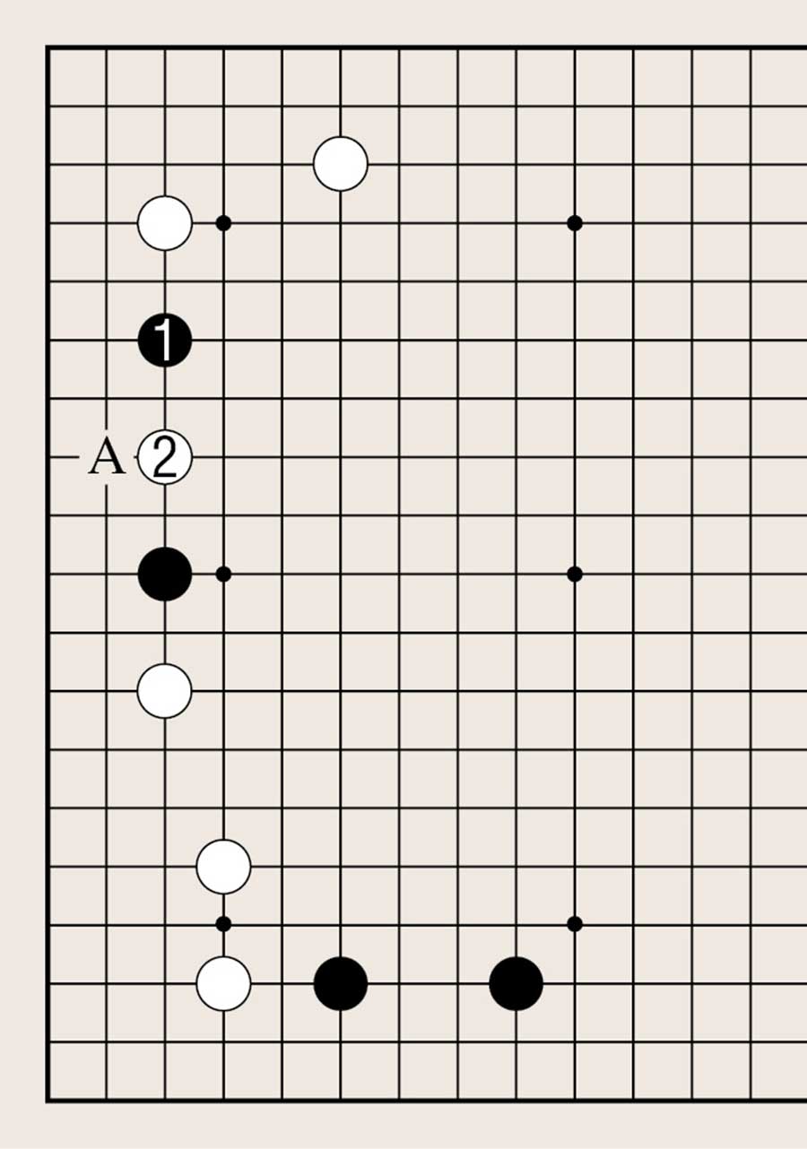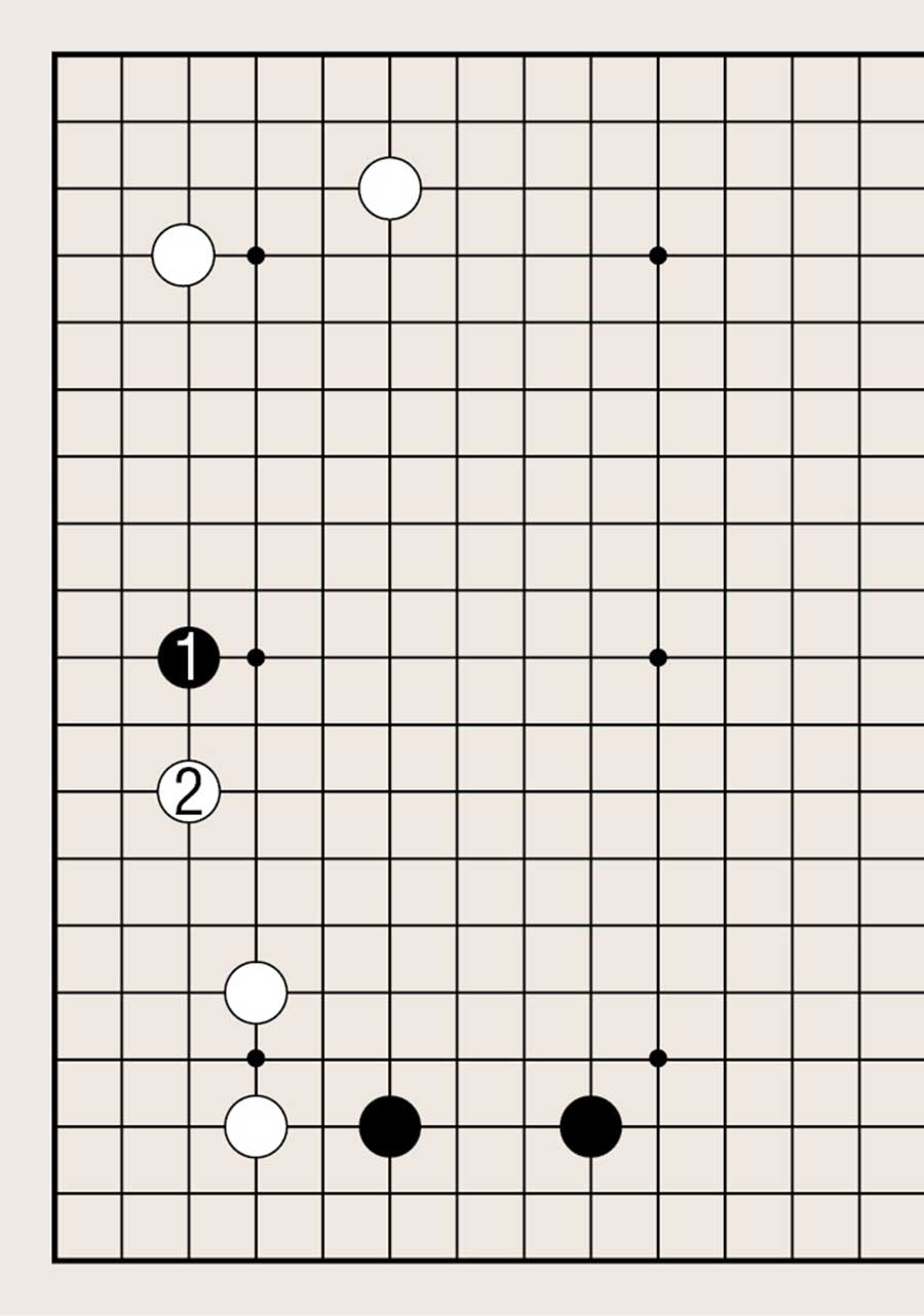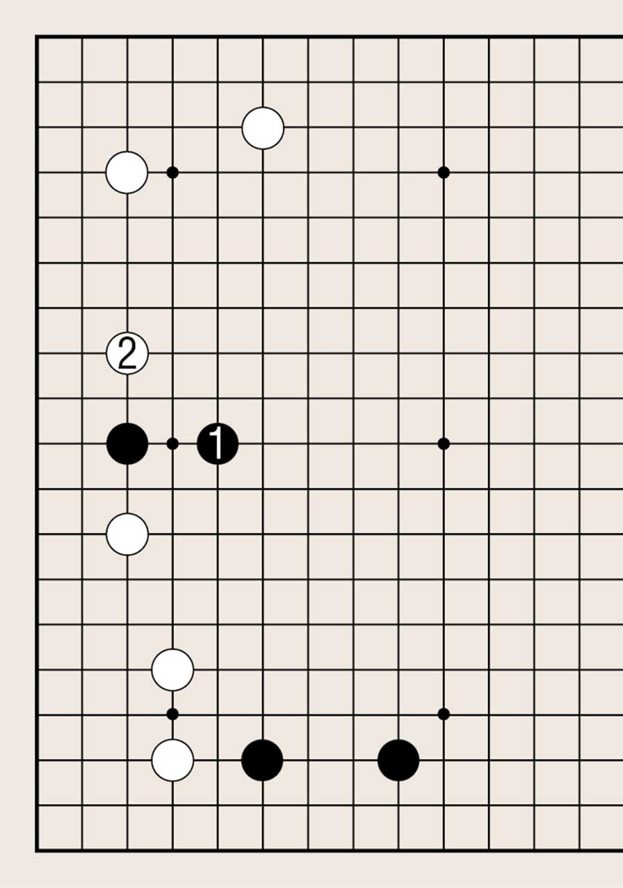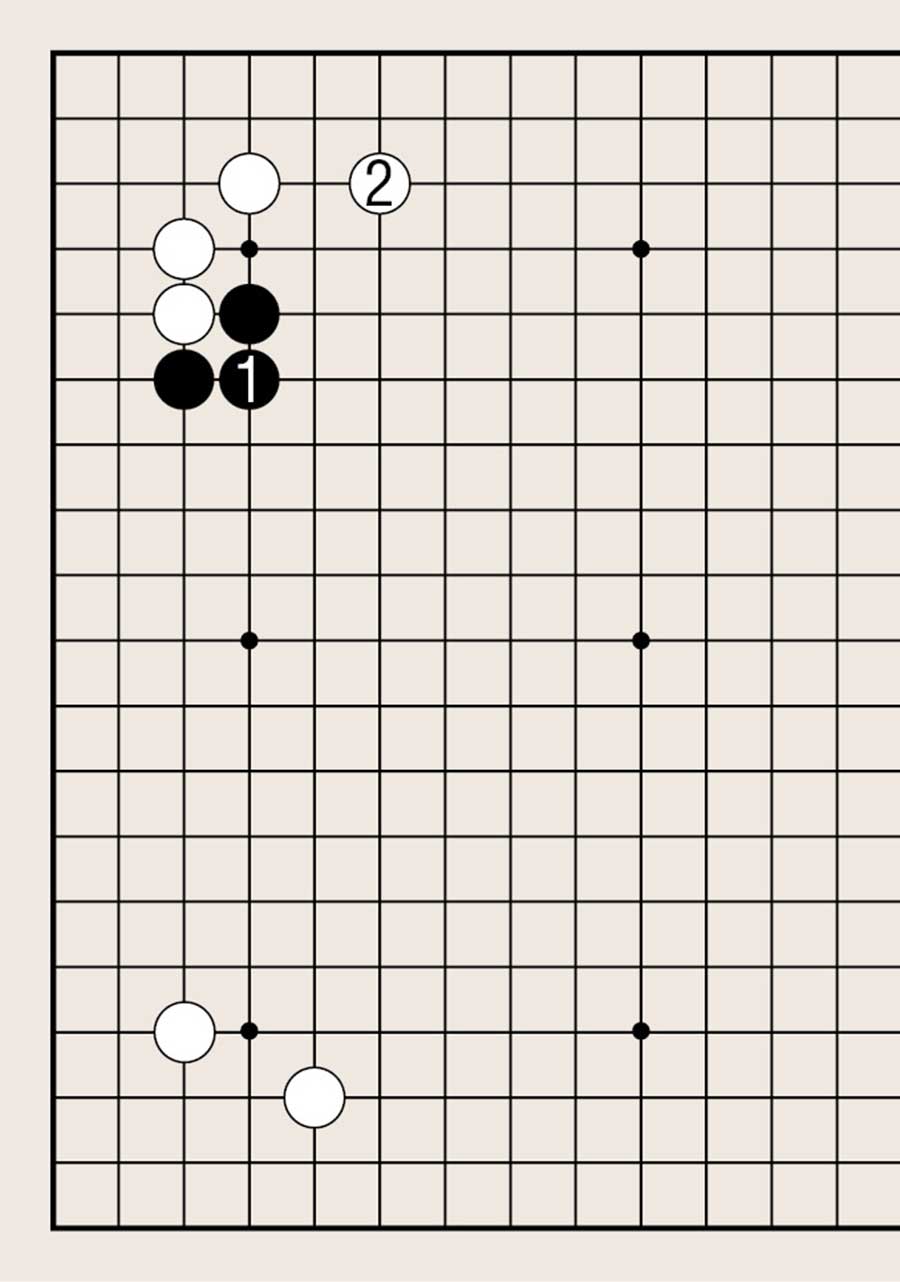 处于低位,像白1下在四线上,提高另一侧白棋的位置是基本要领。由此可知不可单纯地拆二,综合考虑周边棋子的布置很重要。