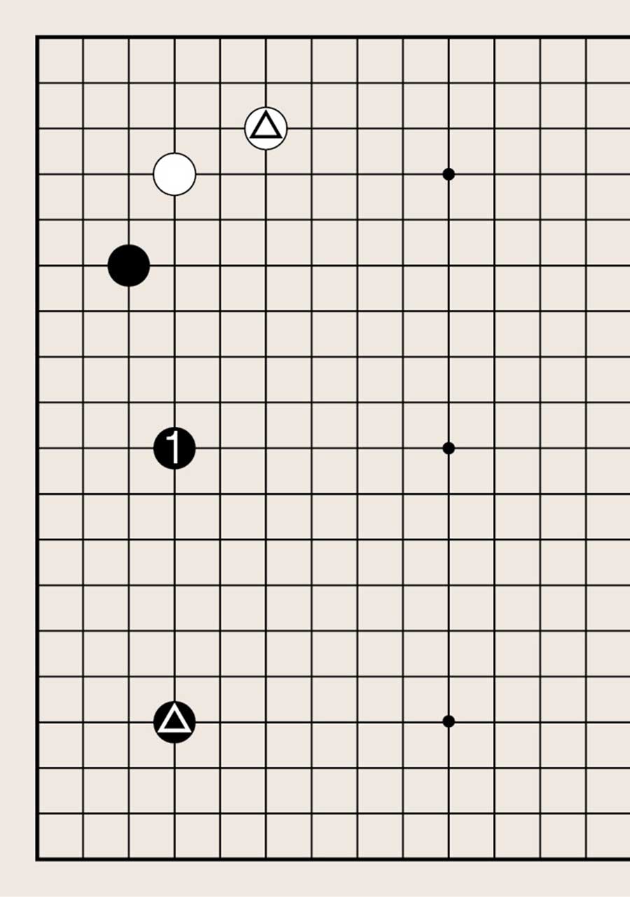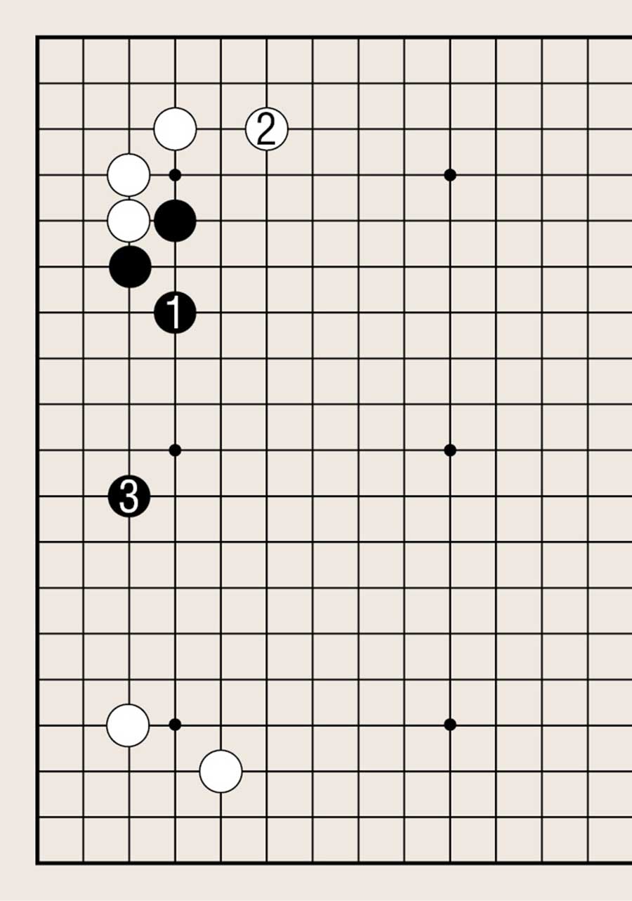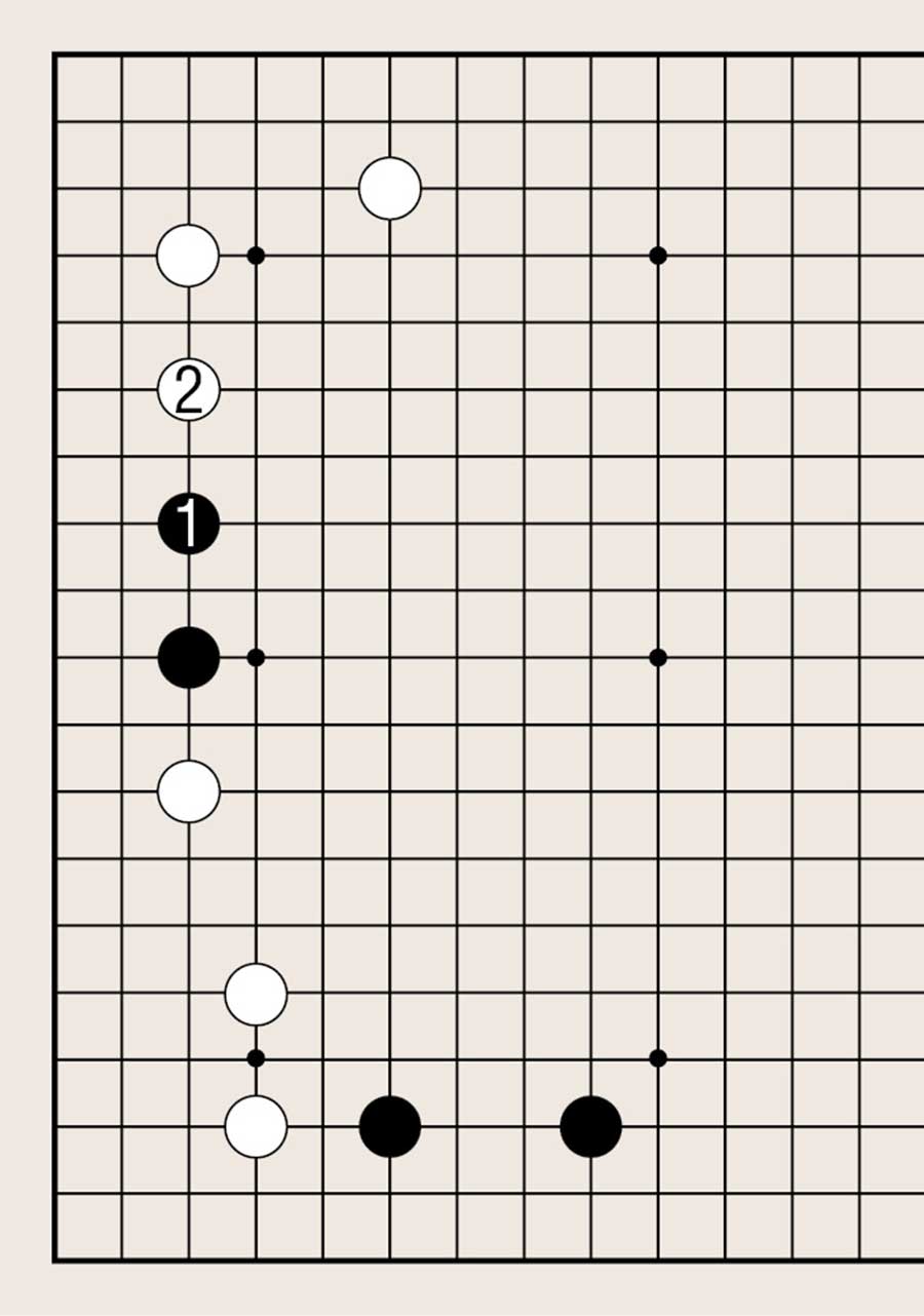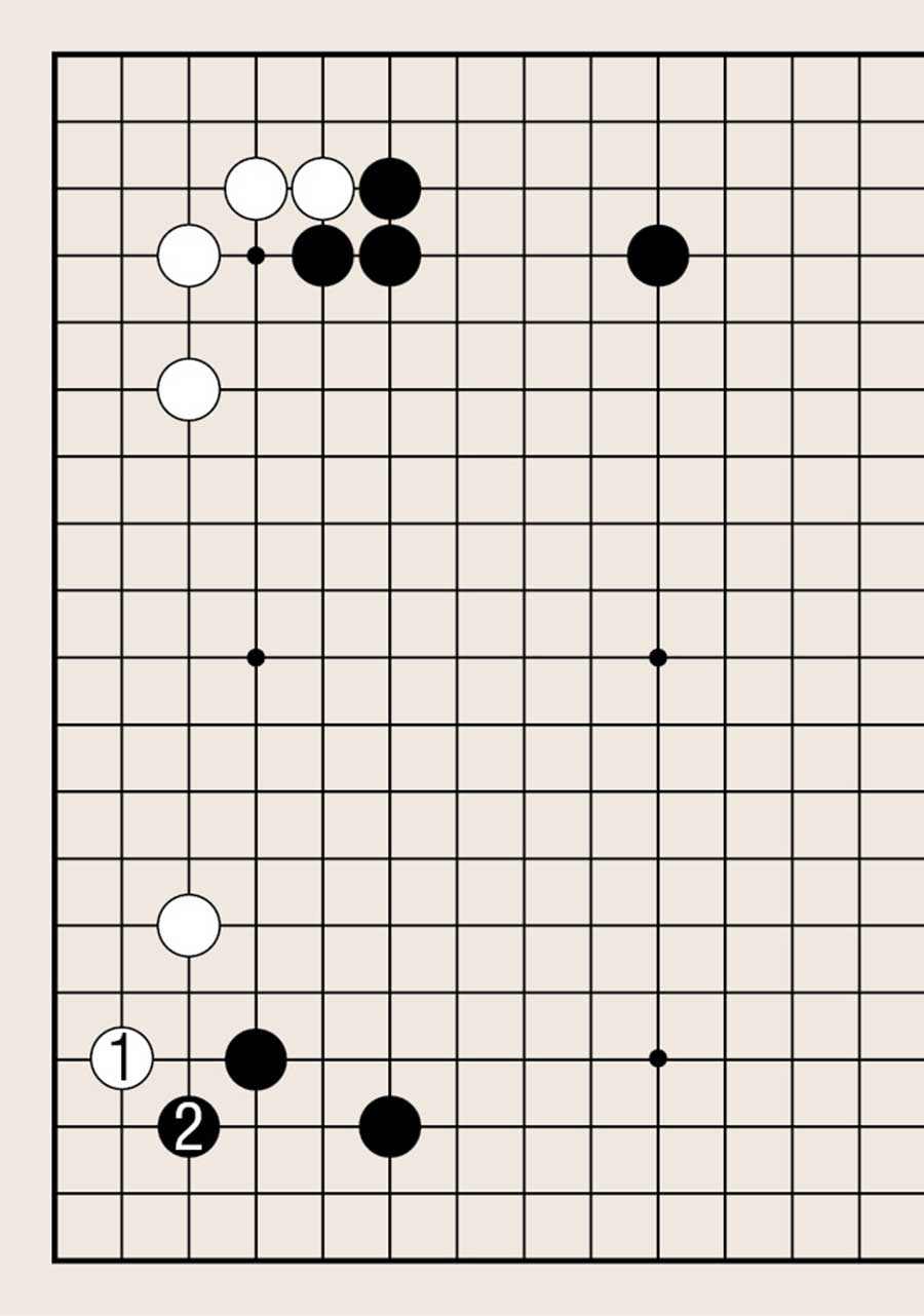 处于低位,像白1下在四线上,提高另一侧白棋的位置是基本要领。由此可知不可单纯地拆二,综合考虑周边棋子的布置很重要。