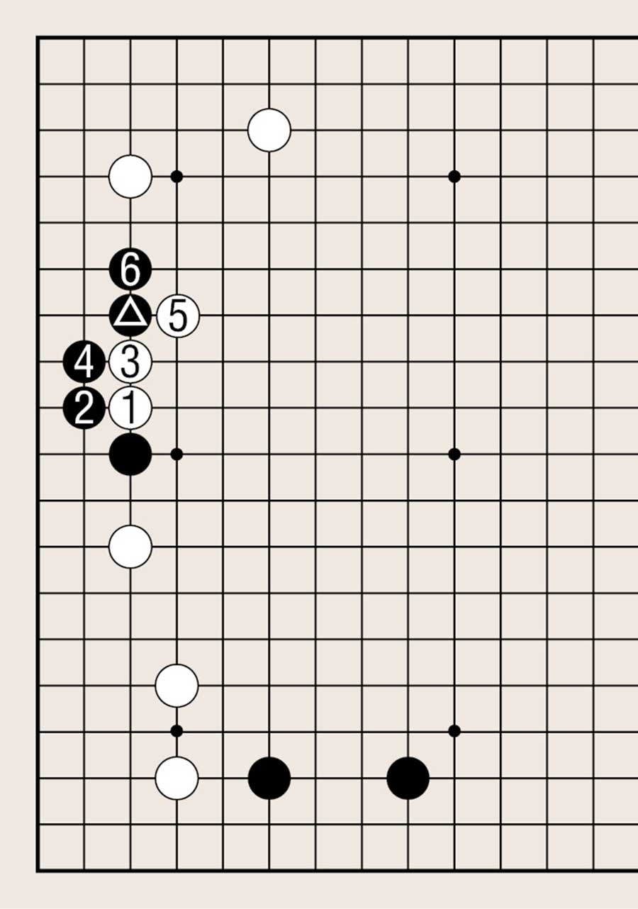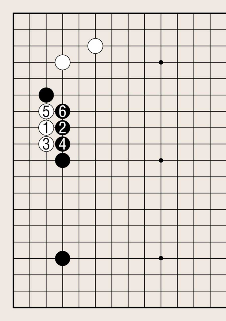 拆二,白1的企图是分断黑棋。但黑2扳后,黑棋已轻易连接。至黑6,黑棋已处理干净。相反白棋的头被扳住,棋形非常不利。