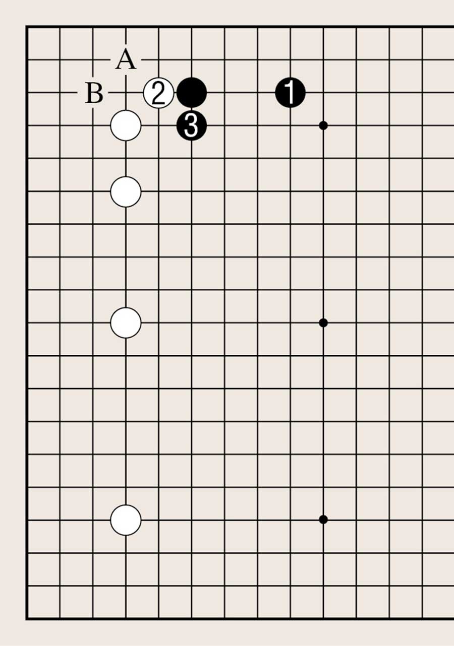 位于低位上,所以黑2尖在四线上是正确的。黑2下在A位也是可能的,如果单纯地下在B位,由于黑棋全都处在低位上,黑棋不满。