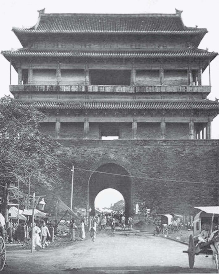 窗外,一片漆黑,还看不到城墙,列车似乎也没有减速而在继续向前飞驰。很快,轰隆一阵声响过后,列车穿过了一个城墙隧道,这才真正驶进了中国北京城。减速了的列车缓慢地沿着将汉人居住区与真正的京城——八旗人居住区分隔开来的高大城墙行进。接下来,右边一座宏伟的大城门——哈德门[2]透过车窗进入视野:北京第一眼。