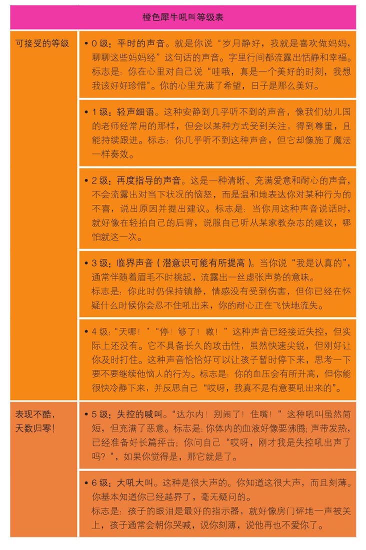 终于有了一个激励人心的名字和标志,太棒了!但我还有一个更大的问题。我很快意识到,很难界定“不吼不叫”实际上意味着什么!我能提高嗓门吗?什么算是坚定的声音?如果我偶然厉声说话又会怎么样呢?如果在紧急情况下,那会儿我能吼能叫吗?就这样,我的“吼叫等级表”诞生了!而且我一直严格地执行到2013年2月6号!那一天,我庆祝了自己做到了一年不冲孩子大吼大叫!