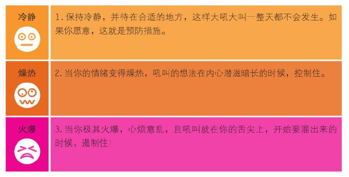 你觉得我的小贴士太疯狂太傻?(比如,在厕所里面大喊大叫;梆梆梆地敲打锅碗瓢盆,整出音乐派对的架势,来发泄一通)那就试试我分享的较为传统的小贴士吧,比如,转身走开,深呼吸,采取预防措施——比如,保证充足的睡眠。
