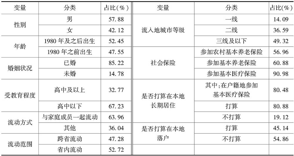 表2是调查样本的描述性统计情况。由表2可知,在调查样本中,男女比例农业转移人口为57.88%和42.12%;年龄在1980年及以后出生的新一代农业转移人口约占52.45%,逐渐超过老一代农业转移人口的数量,正成为农业转移人口的主体;农业转移人口受教育程度普遍偏低,仅有32.77%的农业转移人口拥有高中及以上学历;农业转移人口越来越呈现出家庭化迁移趋势,与家庭成员一起流动的农业转移人口占63.96%;从流动范围看,农业转移人口省内流动超过跨省流动,省内流动占比52.72%,跨省流动占比47.28%,省际流动趋势减缓;从流入地城市看,有14.09%的农业转移人口流入一线城市,36.59%选择流入二线城市,49.32%流入三线及以下城市;从参保状况看,仅56.96%参加了农村基本养老保险,其中,有80.88%的农业转移人口是在户籍地参加的农村基本养老保险,有90.98%的农业转移人口参加了医疗保险,其中,有80.48%的农业转移人口是在户籍地参加的农村基本医疗保险。