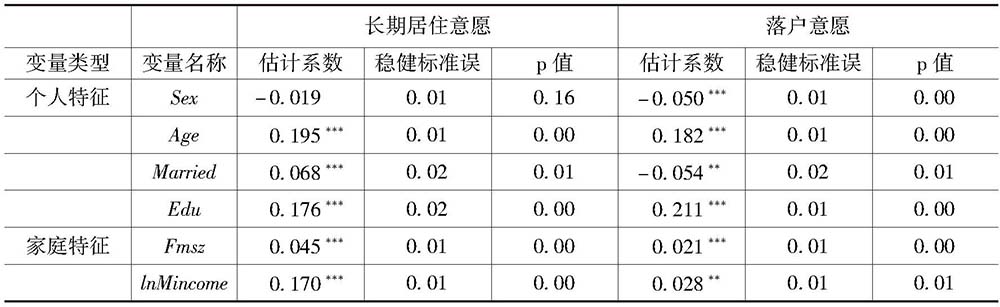 在双变量Probit模型中,两个方程的唯一联系是扰动项的相关性,如果ρ=0,那么此模型等价于两个单独的Probit模型。本文采用双变量模型进行系统估计,ρ=0.98,显著不为0,p值为0.00,在1%的显著水平上拒绝原假设H0∶ρ=0,这表明,农业转移人口的长期居住意愿和落户意愿具有相关关系,如果使用两个单独的Probit模型会存在样本选择偏差问题,本文使用双变量Probit模型是合适的。为验证双变量Probit模型实证结果的稳健性,本文以35周岁(1980年出生)为中心,选择不同的年龄段(如30~40岁、25~45岁等)的调查样本以及根据性别(男和女)选择调查样本进行回归,实证结果没有明显差异。这表明,采用双变量Probit模型估计的结果是稳健的。双变量Probit模型估计结果见表3。