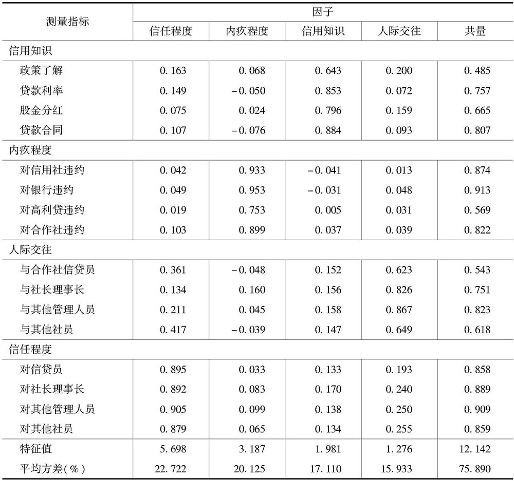 在进行因子分析之前,对这16个变量进行KMO测度和Bartlett球形检验。结果显示,KMO值为0.827,Bartlett球形检验结果达到了0.01的显著性水平。一般认为KMO值为0.9以上表示效果很好,0.7以上表示适合做因子分析,0.5以下表示不适合做因子分析。所以模型检验结果良好,表明所选变量适合做因子分析。本文采取主成分因子分析方法,经过最大方差旋转,共抽取4个因子,因子解释率累计达到75.89%。根据因子负载,这些因子分别被命名为信用知识、内疚程度、人际交往和信任程度。因子分析结果见表2。