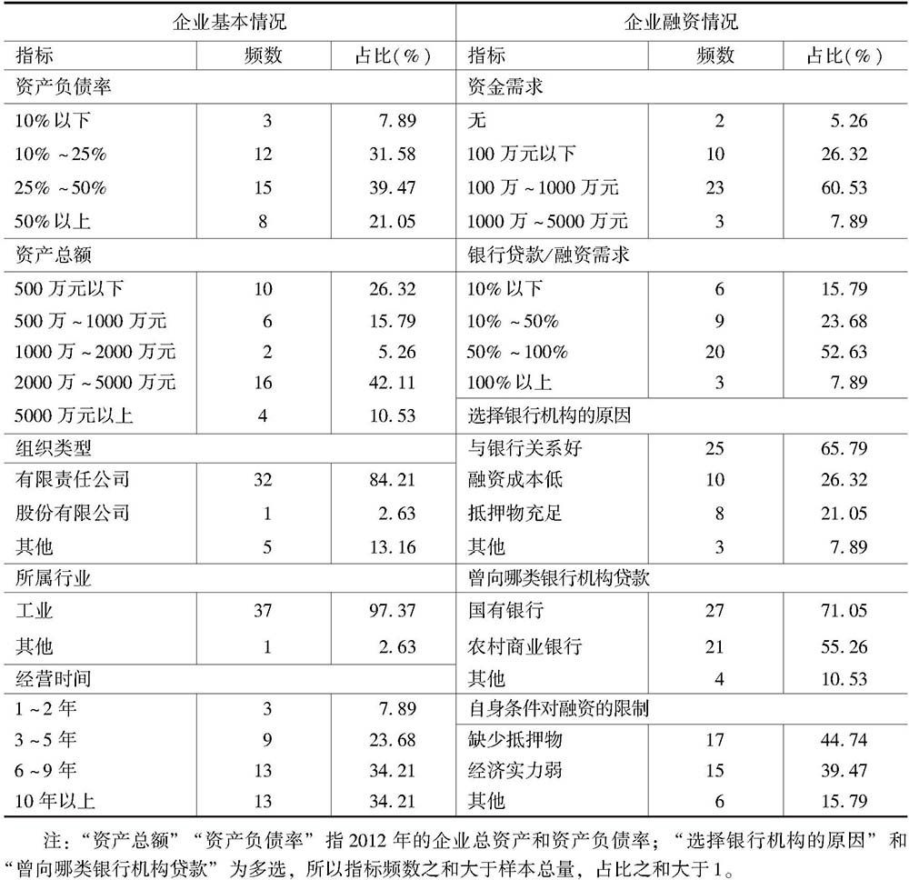 本文使用的数据来自安徽大学中国三农问题研究中心于2013年8月对安徽部分小微企业的融资状况进行实地调研所获得的第一手资料。调研中通过采取随机抽样方式对40家小微企业发放了问卷,最终有效问卷为38份,有效率为95%(数据基本情况见表1)。