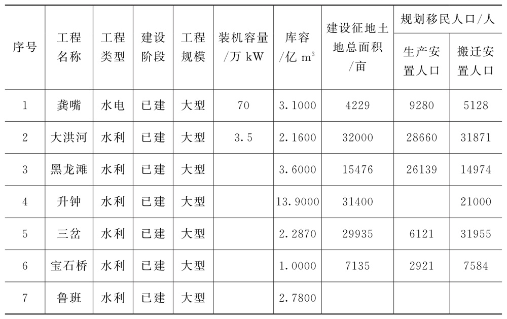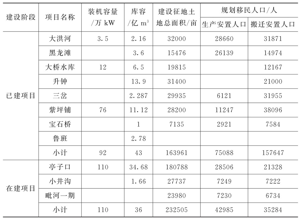 本阶段,国家尚无指导移民安置规划设计和实施工作的国家性政策和规范,移民工作主要参照1958年国务院颁布实施的《国家建设征用土地办法》规定执行。该时期共兴建水利水电工程7座,包括龚嘴水电站、鲁班水库、宝石桥水库、大洪河水库等,涉及装机约73.5万kW,库容约28亿m3,建设征地面积约12万亩,规划生产安置人口约7.3万,搬迁安置人口约11.3万,见表2.6。