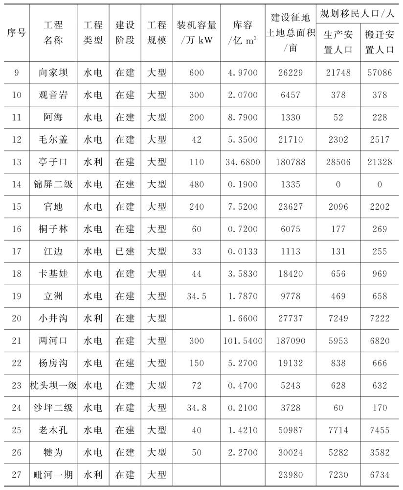 本书重点以大型水利水电项目为对象,全面梳理分析了现阶段四川省内大型水利水电工程建设情况(表2.2~表2.4)。截至2013年6月,四川全省已建大型水利水电工程共计17个,包括水利项目8个,水电项目9个,装机容量共约853万kW,库容约134亿m3,建设征地土地总面积约19.8万亩,规划移民生产安置人口约16万、搬迁安置人口约22万。在建大型水利水电工程29个,包括水利项目3个,水电项目26个,装机容量共约6096万kW,库容约561亿m3,建设征地土地总面积约105万亩,规划移民生产安置人口约25万、搬迁安置人口约29万。