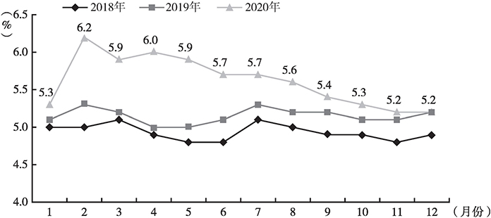 受新冠肺炎疫情对复工复产的影响,2020年上半年调查失业率同比明显升高,其中2月达到6.2%。随着疫情逐步得到控制和稳定,以及政府推出一系列稳就业政策措施,调查失业率有所下降(见图1)。调查失业率高企,一方面是新冠肺炎疫情的影响,另一方面是前一阶段经济结构调整,经济增速下行所带来的延续性影响。在新冠肺炎疫情暴发之前的2019年,各月份的调查失业率相比2018年也较高。