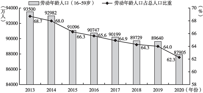 图2 2013~2020年劳动年龄人口及其占总人口比重变化情况