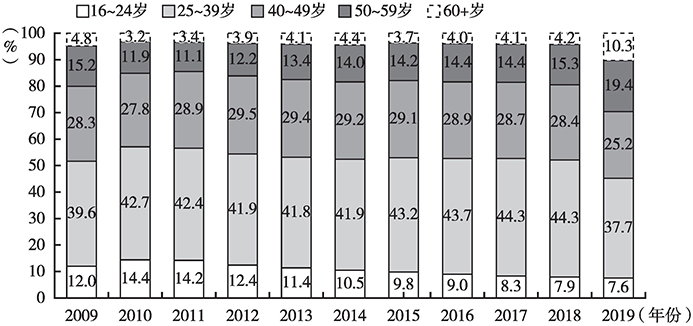 图5 2009~2019年我国城镇就业人员年龄构成变化