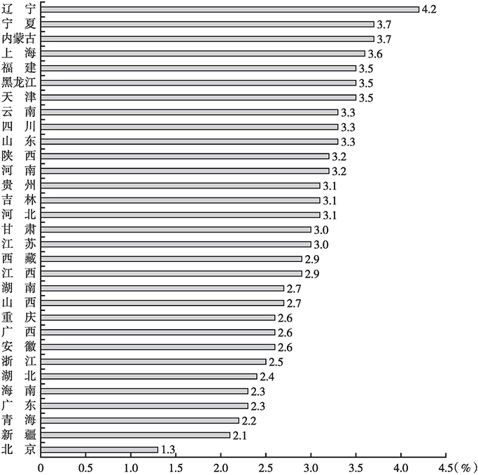 从31个省(区、市)的城镇登记失业率数据来看,总体而言,2019年各省(区、市)城镇登记失业率均值有所下降,2019年为2.95%,而2018年为3.11%。2019年,城镇登记失业率最高的三个地区分别是辽宁(4.2%)、宁夏和内蒙古(3.7%)。这三个地区,近年城镇登记失业率都相对较高,位于东北和西北地区,经济增速相对较低,也是资源性城市较多的地区,受去产能政策影响较为突出。城镇登记失业率最低的三个地区依次是北京(1.3%)、新疆(2.1%)和青海(2.2%)(见图7)。北京包括就业服务在内的各项公共服务水平均较高;新疆近年受到国家的大力支持,“十三五”时期,中央企业在新疆累计投资项目达3.2万个,完成投资7670.5亿元,有效促进了当地就业;青海“十三五”期间GDP平均增长速度为8.08%,也高于全国平均水平。