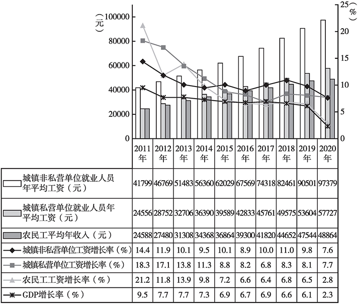 图8 2011~2020年不同职工群体年平均工资及增长率