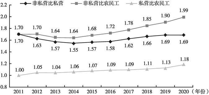 农民工与其他类型职工群体的工资差距扩大。2020年,城镇非私营单位就业人员平均工资与私营单位就业人员平均工资的差距与上年持平,但两者与农民工收入差距进一步扩大(见图9)。可见,农民工受疫情的冲击和影响较大,其收入和生活保障问题更值得关注。尤其是近年平台经济和零工经济崛起,用工灵活化和去劳动关系化,农民工受疫情和经济波动的冲击更为明显。