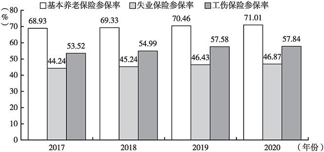 图10 2017~2020年职工基本养老保险、失业保险和工伤保险参保率
