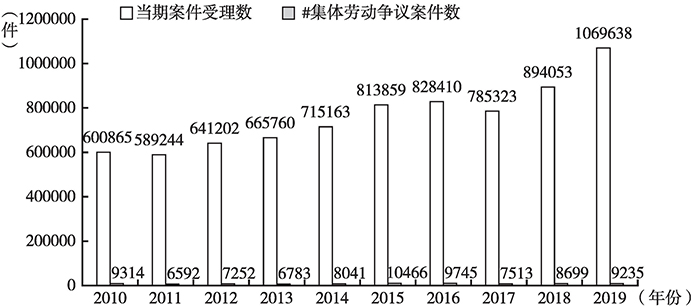 2019年劳动争议受理数达到1069638件,比2018年增幅明显(见图13),增幅达到19.64%。其中集体劳动争议9235件,显示在近年经济增速下行的背景下,包括集体劳动争议在内的劳动争议案件有所增加。