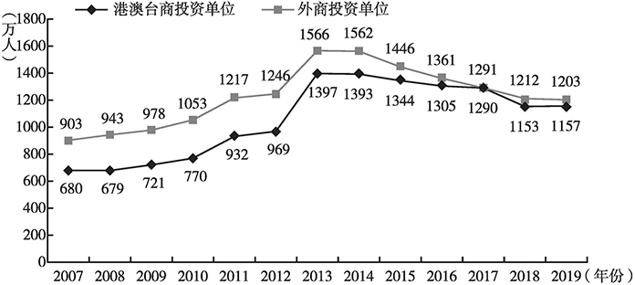 图14 2007~2019年港澳台商投资单位和外商投资单位就业人数变化