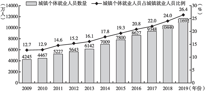 图15 2009~2019年城镇个体就业人员数量和占城镇就业人员比例