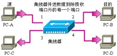 集线器除了共享带宽这一不足之处外,还有另一个方面的不足必须要考虑,那就是它的广播工作方式。因为集线器属于OSI七层模型的物理层,基本上不具有“智能”的能力,更别说“学习”功能了。它也不具备交换机所具有的MAC地址表,所以它发送数据时都是没有针对性的,而是采用广播方式发送。也就是说,当它要向某结点发送数据时,不是直接把数据发送到目的结点,而是把数据包发送到与集线器相连的所有结点。如图2-3-2所示,源主机PC-A需要发送数据到目的主机PC-B,PC-A把数据包发往集线器,集线器从端口1收到数据包后,然后把该数据包复制,并把信号放大后从端口2、3、4发送出去,尽管PC-C和PC-D不是目的主机,它们也会收到PC-A给PC-B发的数据包。所有通过集线器(不管有多少个集线器)互连的网络属于同一个网络,只有一个广播域、一个冲突域。