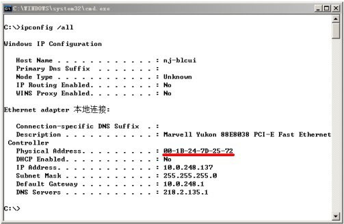 可以在DOS窗口中使用“ipconfig/all”命令查看计算机网卡的MAC地址,如图2-3-3所示,网卡的MAC地址是“00-1B-24-7D-25-72”,占用48位,前24位表示厂商,后24位为设备编号,用十六进制表示。