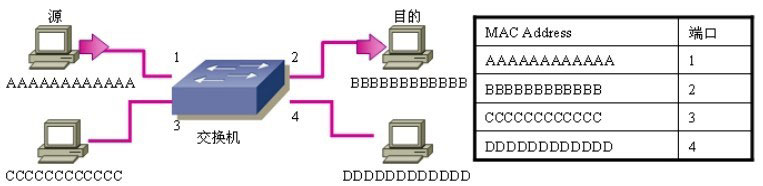 与网桥的工作过程类似,交换机也根据源MAC学习,根据目的MAC进行转发,按每一个数据帧中的MAC地址决策信息转发。在图2-3-5中,交换机也会学到并维护表中的MAC地址表,当源主机“AAAAAAAAAAAA”发送一个数据帧给目的主机“BBBBBBBBBBBB”时,交换机收到这个数据帧,查找交换机的MAC地址表,发现目的MAC地址在交换机的端口2,交换机从端口2把数据帧转发出去,端口3和端口4不受影响。