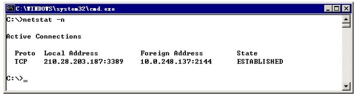 这里介绍一种识别不同应用所使用服务端口的方法,譬如查看Windows中“远程桌面”服务所使用的服务端口。假如在计算机“10.0.248.137”上,使用远程桌面登录到计算机“210.28.203.187”,然后在被控制的远程计算机上执行“netstat -n”命令(当然也可以在本地计算机上执行这个命令),如图2-3-6 所示,可以看到远程主机上使用的是“3389”端口,这就是Windows远程桌面使用的默认端口。采用类似的方法,可以获知其他应用所使用的端口号。