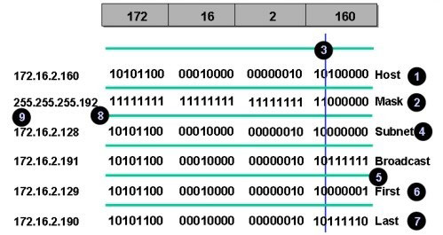 例2:一台计算机的IP地址和子网掩码是172.16.2.160/26,如何计算出该计算机所在的子网地址、子网广播地址、该子网中第一个可用的 IP 地址、该子网中最后一个可用的IP地址、该子网中共有多少个IP地址可用?
